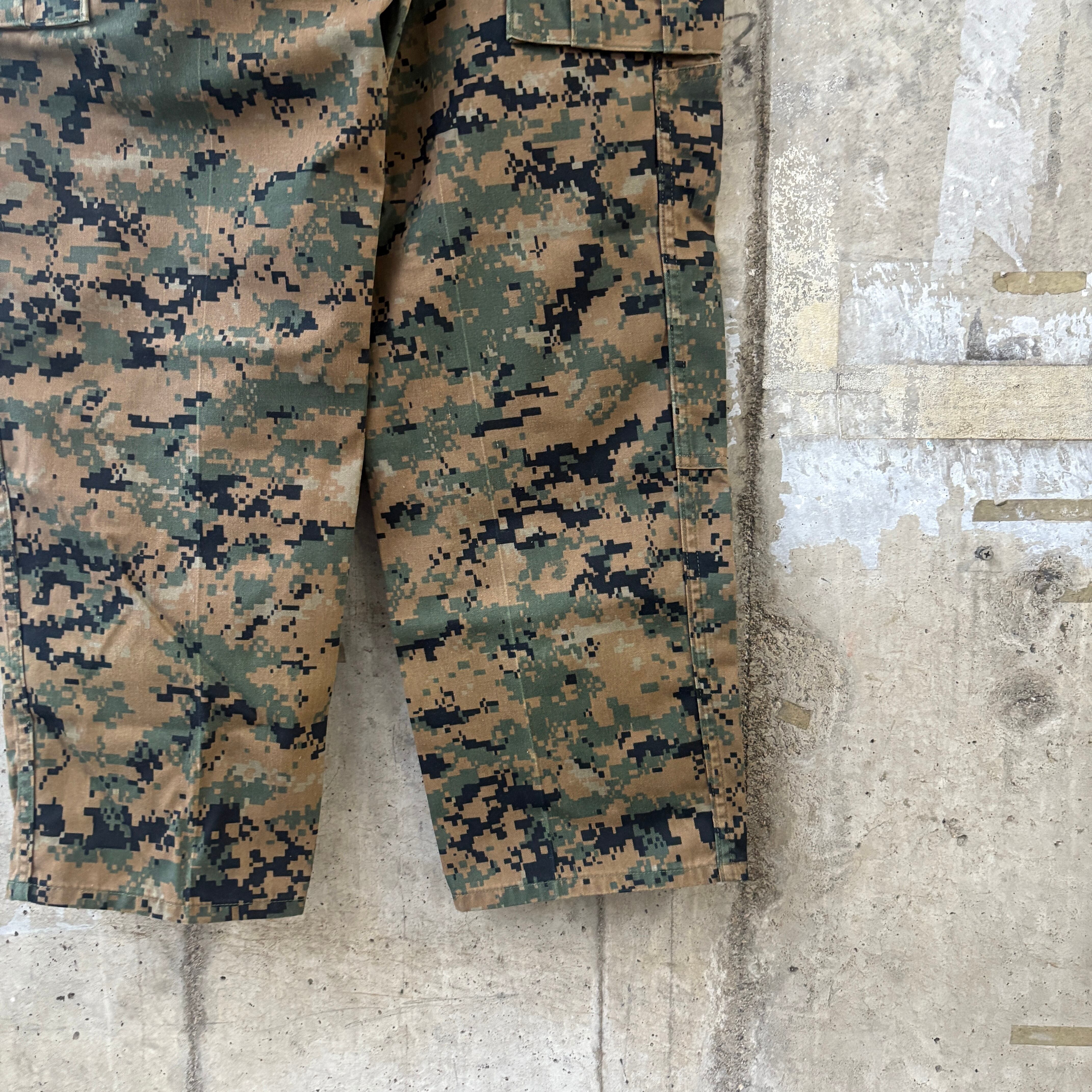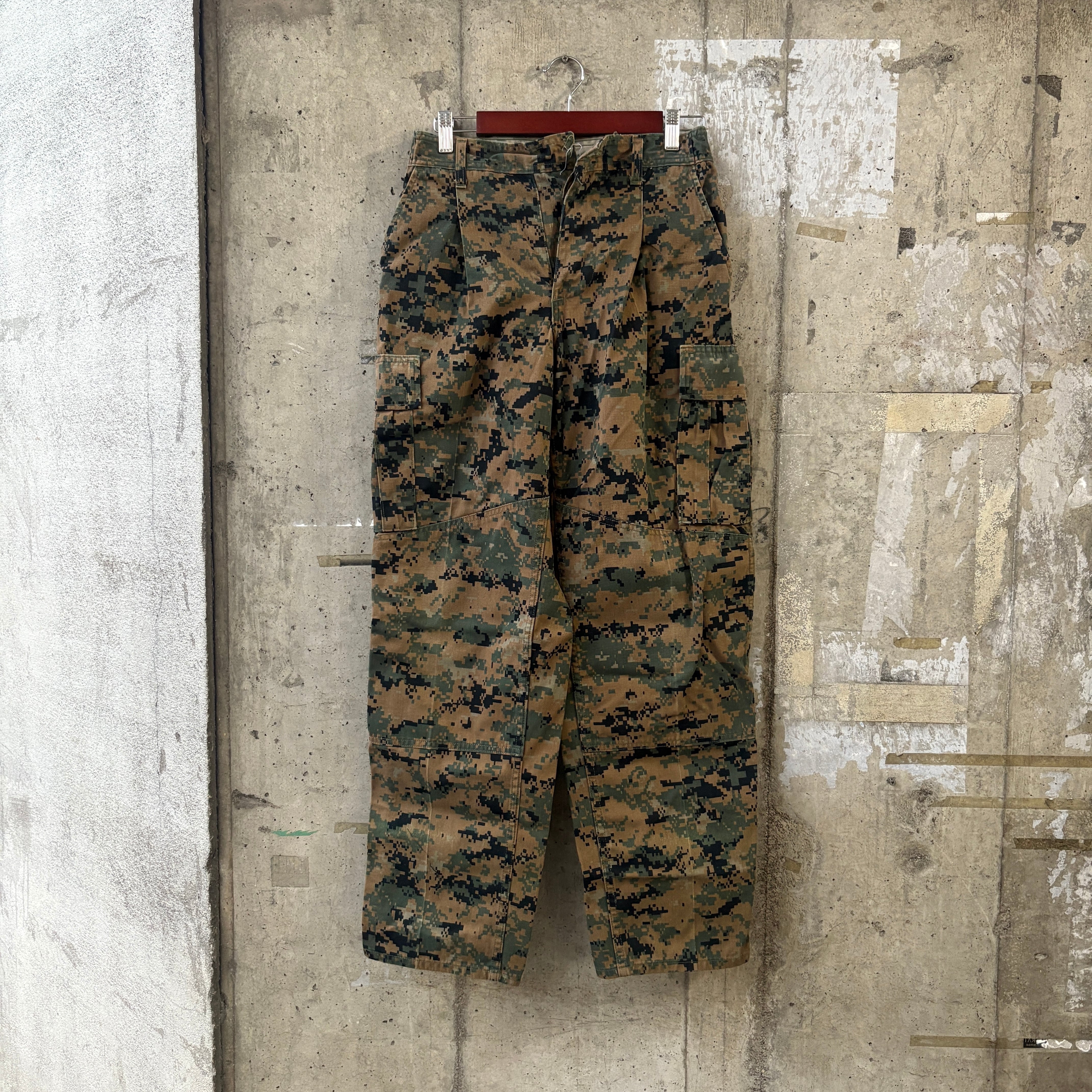 アメリカ軍の海兵隊"USMC"のミリタリーパンツ。デジタルウッドランド迷彩というカモパターン。ウエストにゴムが入っていますので、ベルトをしなくてもコンパクトにフィットする万能さ。(ベルトループもあります。)都会感のある迷彩をお探しの方にオススメです(写真にてボタンが取れていますが、元々ついていたものをつけて発送します)
