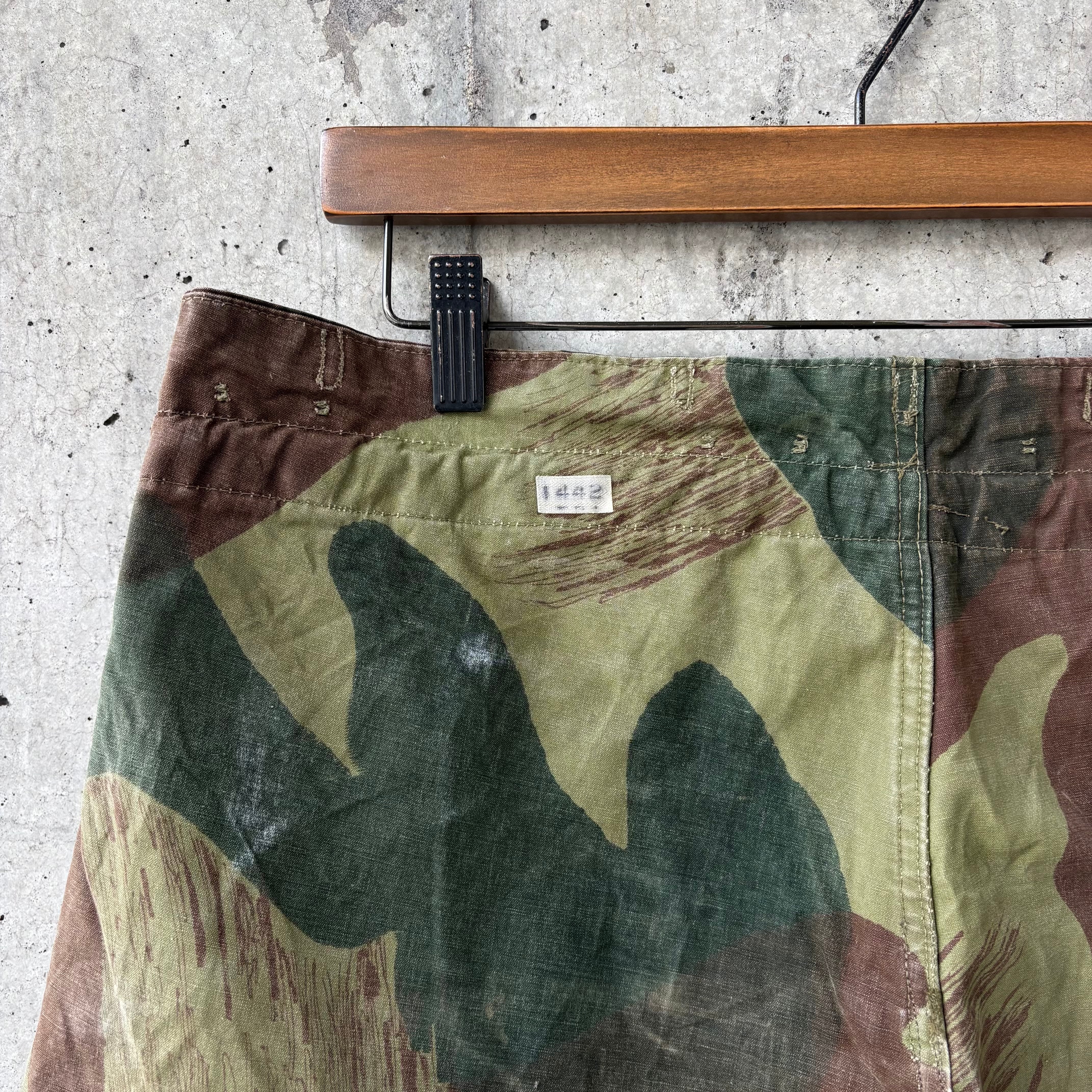 滅多にお目に掛かることのないベルギー軍のブラッシュストロークカモ。「カモ」とはカモフラージュを意味し、ブラシで描いたような迷彩柄が特徴です。軍用服のため、動きやすさのためにお尻のマチが広くなっていたり、膝の辺りは裏に別の布が縫い付けてあり破れにくくなっていたり、さらに裾には水抜きや通気性のための穴があるなど、普段の服には見ることの出来ないミリタリーならではのディテールが詰まっています。この迷彩柄は短期間しか製造されておらず、またそもそもベルギー軍自体規模が小さいためとても希少な一着です。