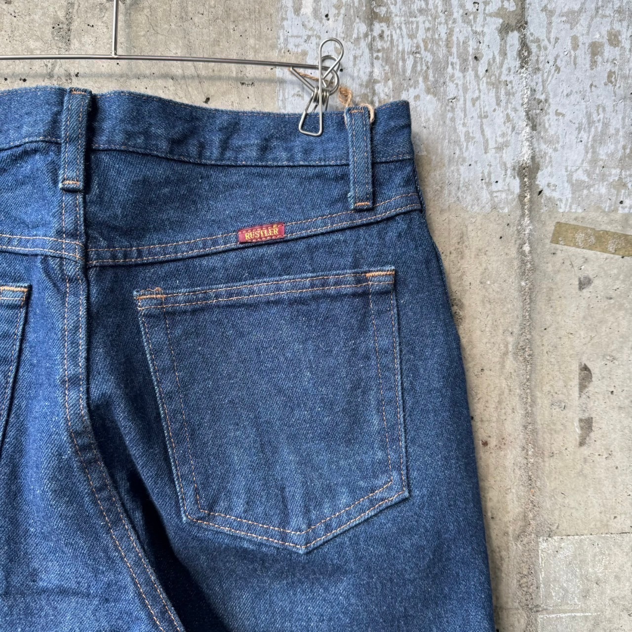 "Wrangler" の兄弟ブランドで、大衆向けにアメリカ国内でのみ販売されている "Rustler" のストレートデニムパンツ。最近次第に古着屋でピックアップされ始めている注目のラインであり、装飾等がほとんど廃されているミニマルなデザインが特徴です。本品は特に状態が非常によく、色も濃く残っています。これからさらに人気が出るであろう、注目の一品。