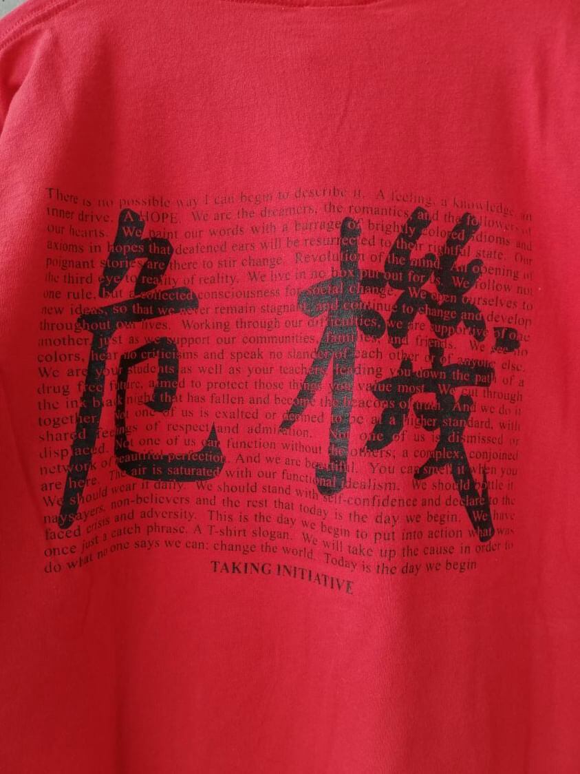 詳細は不明ですが、啓発系のメッセージがプリントされたT-SHIRT。”Talking initiative”とは「率先して行動する」という意味で、バックには大きく「危機」の文字。2004という表記があることから2004年に行われた何らかの啓発系キャンペーン用かと思われます。かなりインパクトがあるので、シンプルになりがちな夏に重宝する一品。