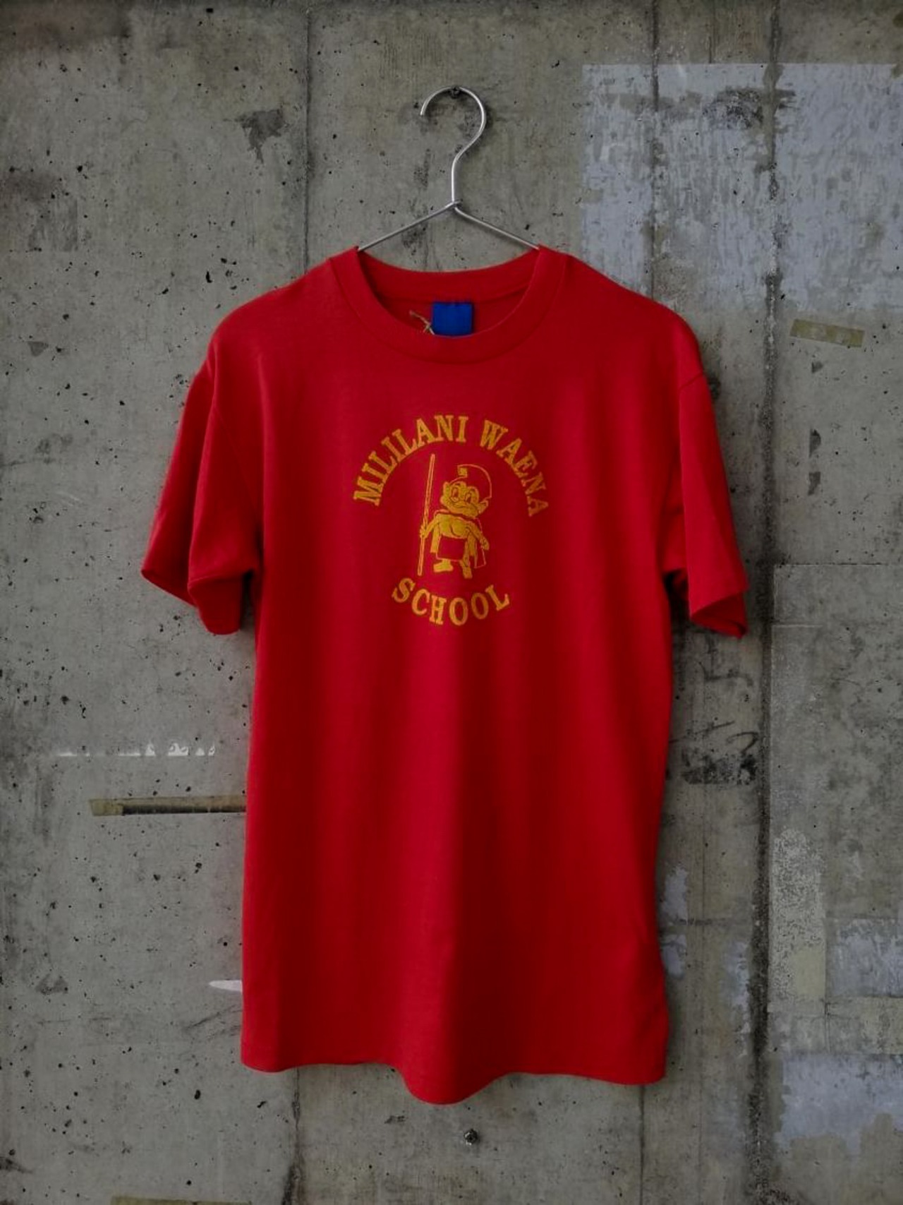 ハワイにある"MILILANI WAENA SCOOL"という小学校のT-SHIRT。ボディがかなりテロテロで、プリントも若干剝げかかっているため”THE 古着”感を放つ一品。